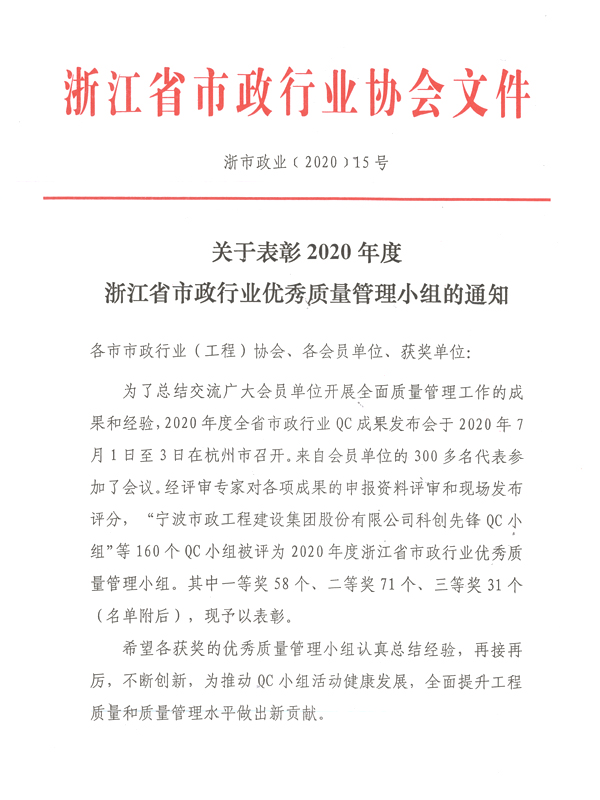 2020仙居河埠大橋浙江省市政優秀QC二等獎