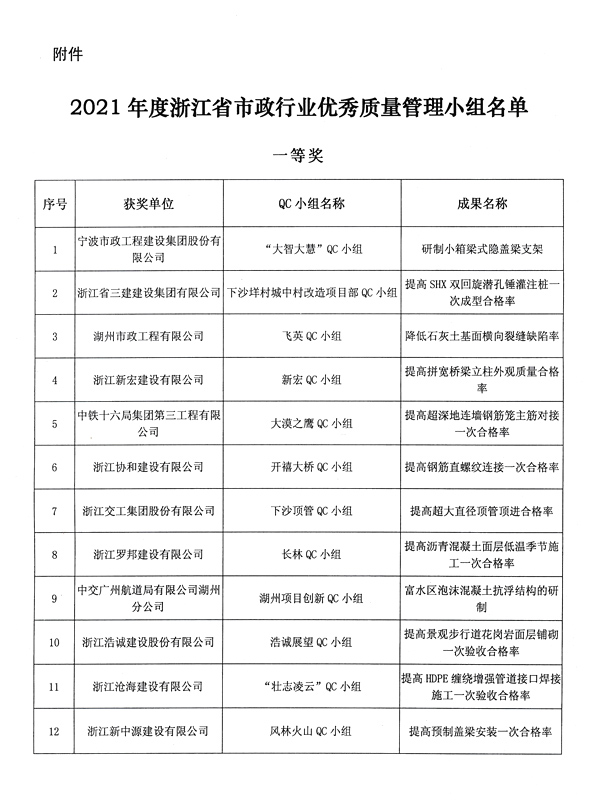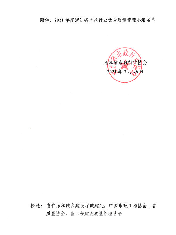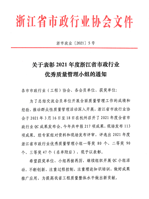 關(guān)于表彰2021年度浙江省市政行業(yè)優(yōu)秀質(zhì)量管理小組的通知